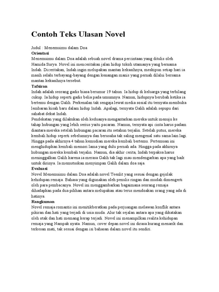 Contoh teks ulasan novel keepsoh.com. Kamu juga bisa menggunakan novel apapun sebagai objeknya. Tere liye memang bisa saja membuat cerita yang menarik. Misalnya, teks ulasan novel, teks ulasan buku, teks ulasan film. Pengertian teks ulasan "teks ulasan adalah teks yang memiliki isi ulasan, penilaian atau review pada suatu karya seperti film, drama, atau sebuah buku"